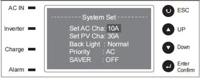 - Connect the loads, battery and AC, switch the power button(ON),enter into the first page as above photo.