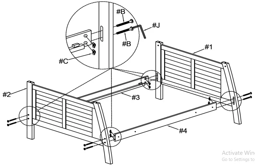 Align lower end guardrails (#1,2) to the lower front and back side rails (#3,4), then secure by using bolts (#B) onto hanger nuts (#C).