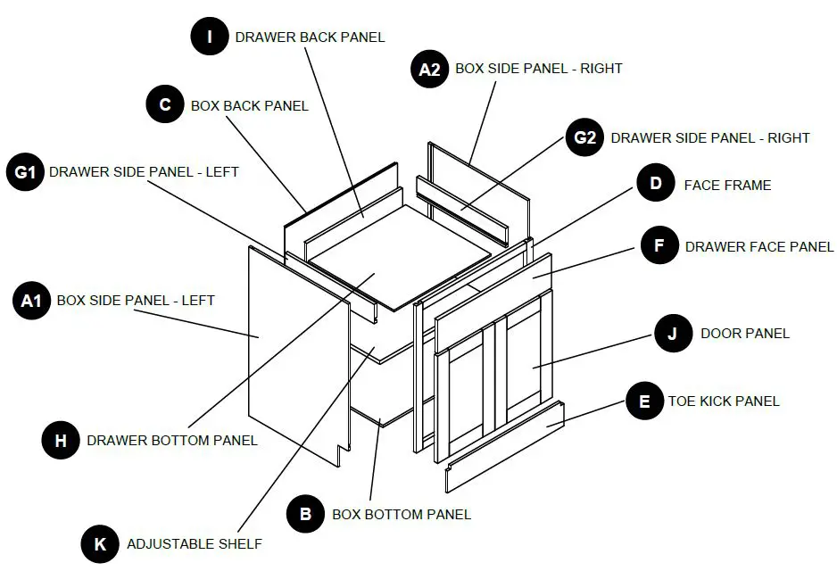 drawer side panels slightly and insert the drawer bottom panel (H) and the
