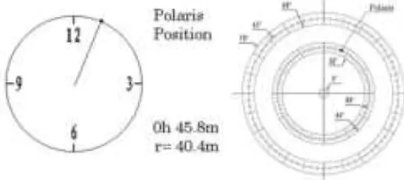 * Use the Hand Controller (MENU => “Align” => “Pole Star Position”) to display the Polaris Position on the LCD screen, as indicated in the left side of the figure below. For example, June 22, 2014, 20:19:42 in Boston, US (alt N42°30’32” and long W71°08’50”), 300 min behind UT, the Polaris Position is 0h45.8m and 40.4m.